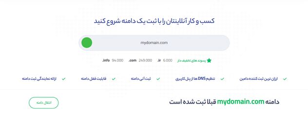 - با نام دامنه شروع کنید: در ابتدا به یکی از وب سایت های ایرانی یا خارجی ثبت کننده نام دامنه سر بزنید و نام مورد نظر خود را در قسمت مربوطه جستجو کنید تا دسترس پذیری آن را ببینید و چنانکه پیشتر توسط فرد یا شرکت دیگر خریداری نشده باشد، امکان تملک آن نام دامنه بنا به توان مالی تان برای شما وجود دارد.